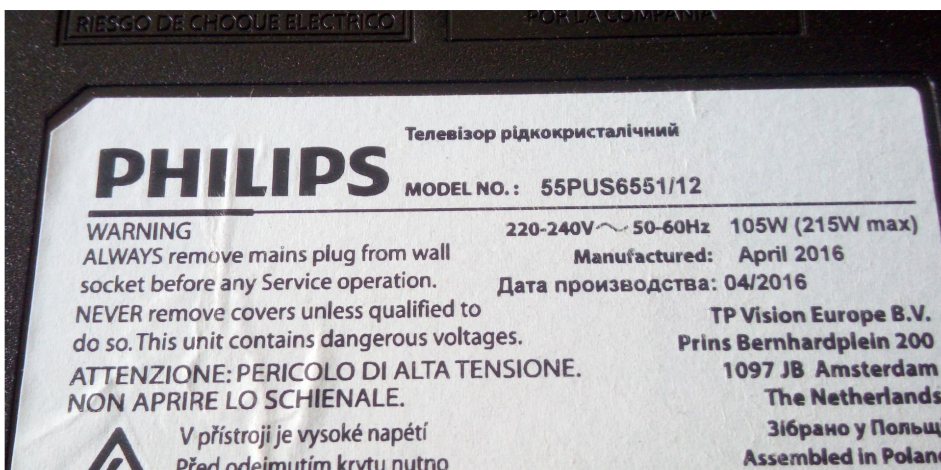 Tv Type and size Philips 55PUS7101/12